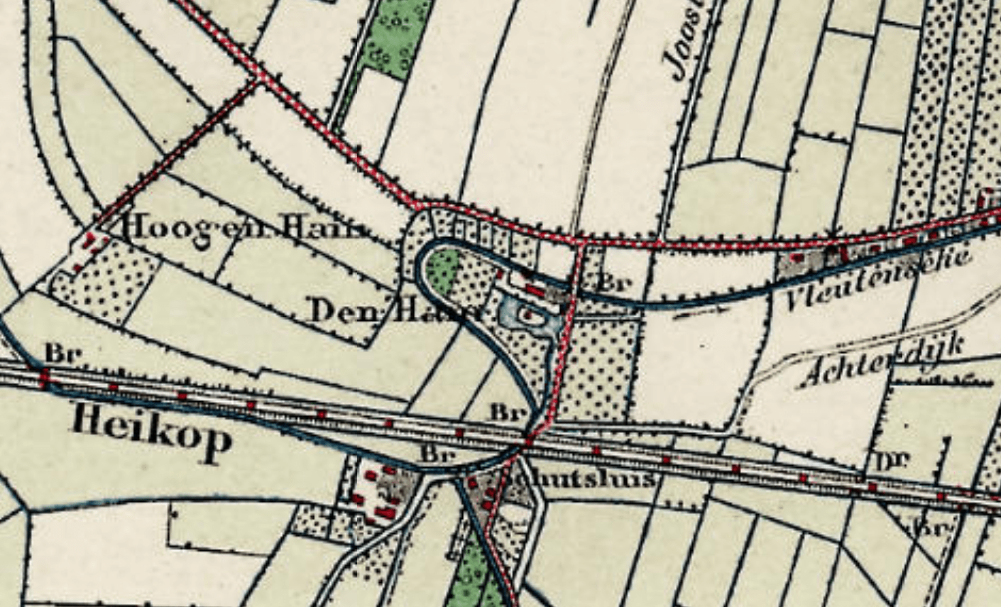 Ik maak wat uitsnedes op topotijdreis van diverse Hammen. De eerste is Huis Den Ham ten westen van Vleuten. Daar is het nat, dat geloof ik direct. Het huis ligt in een binnenbocht van de Vleutensche Wetering.