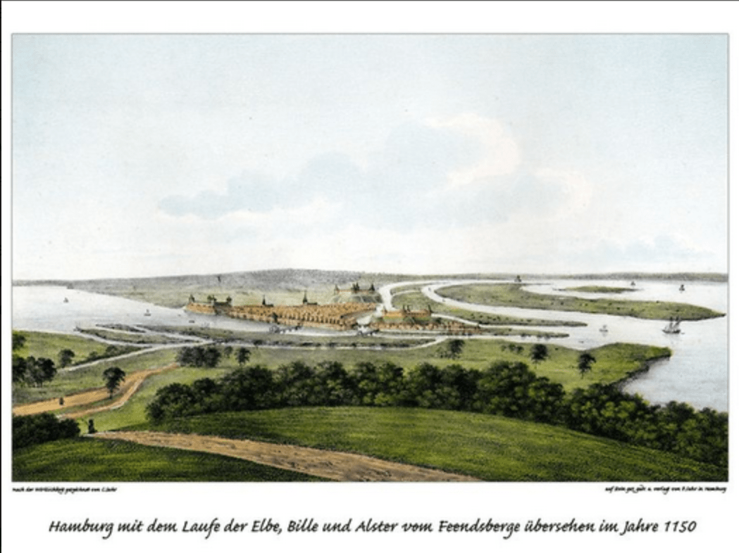 Nou, water genoeg daar bij Hamburg. Rechts de Elbe, links de Alstersee. Maar niet overal langs een rivier liggen natte gronden. Niet in een buitenbocht bijvoorbeeld, die is steil. Wel in een binnenbocht, dus toch weer dat hoekje.