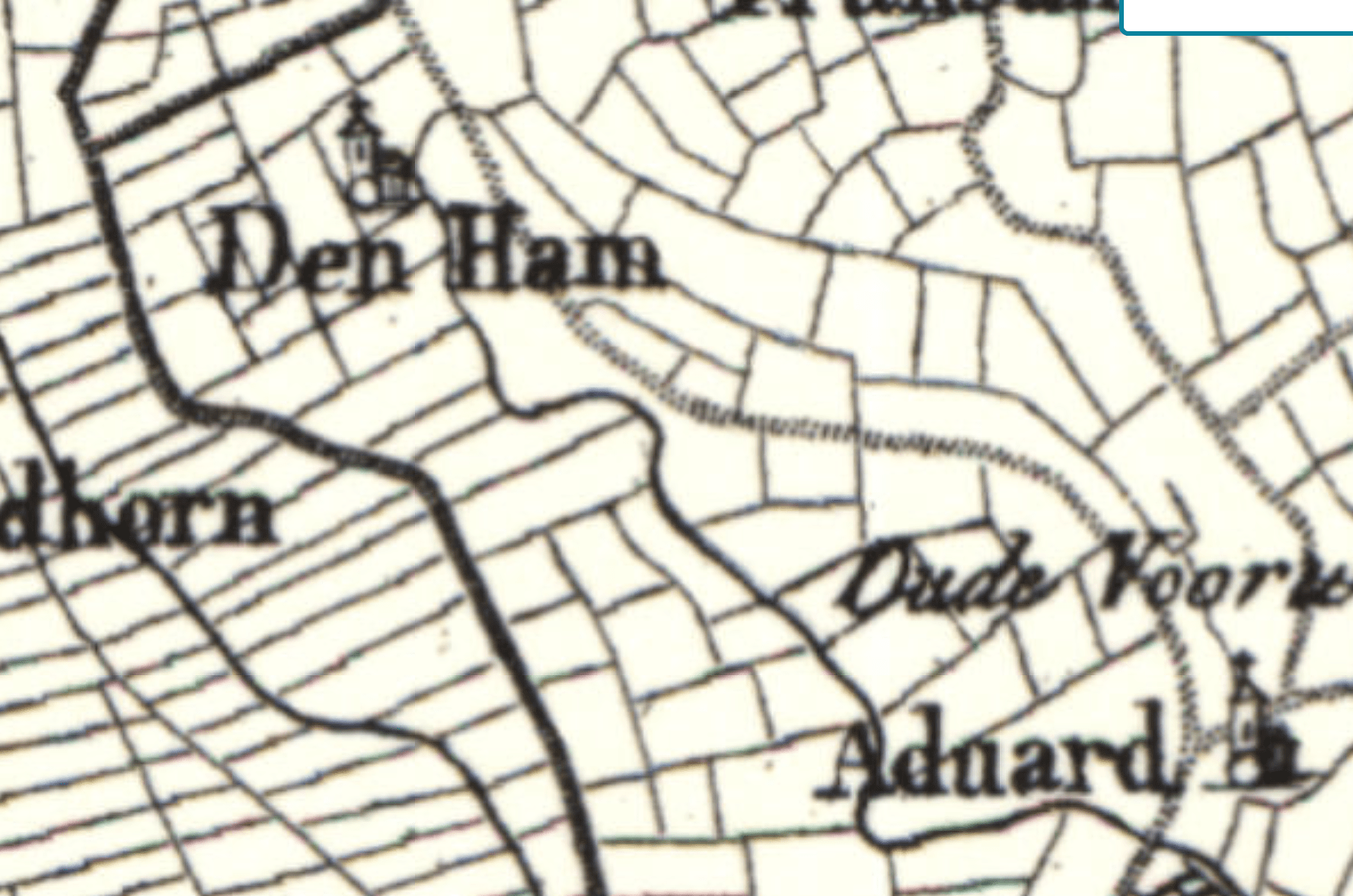 Het buurschap Den Ham ten NW van Aduard in Groningen in 1843 ligt bij een S-bocht in een watertje dat als ik het goed zie, Ham heet.